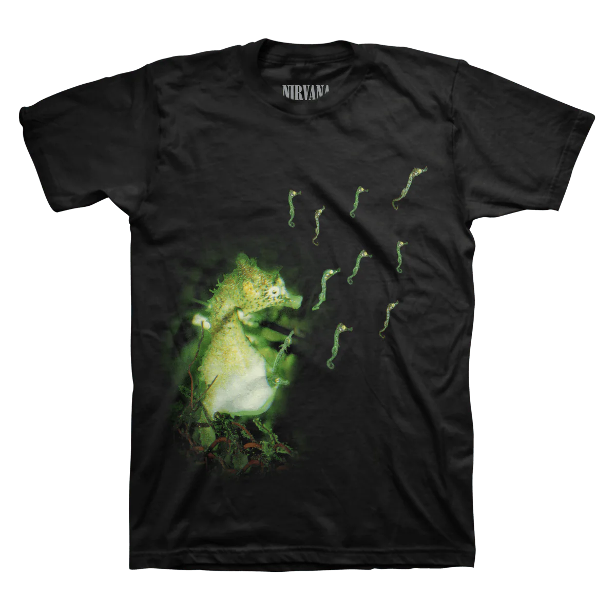Printed on a black 100% ringspun cotton tee with custom Nirvana neck labels.
